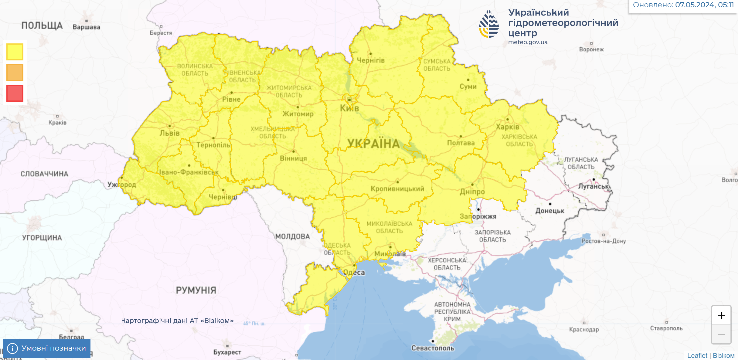 «У найближчі 2-3 години з утриманням до кінця доби 7 травня в Україні, крім південно-східної частини, грози, подекуди шквали, 15-20 м/с. I рівень небезпечності, жовтий», – зазначили в Укргідрометцентрі.