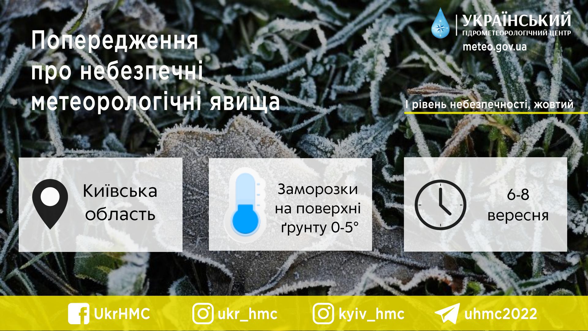 «Вночі 6-8 вересня в Україні, крім Закарпаття та південної частини, на поверхні ґрунту заморозки 0-5° - I рівень небезпечності, жовтий. У північно-східних та східних областях і у повітрі 0-3° - II рівень небезпечності, помаранчевий», - зазначили Укргідрометеоцентрі.