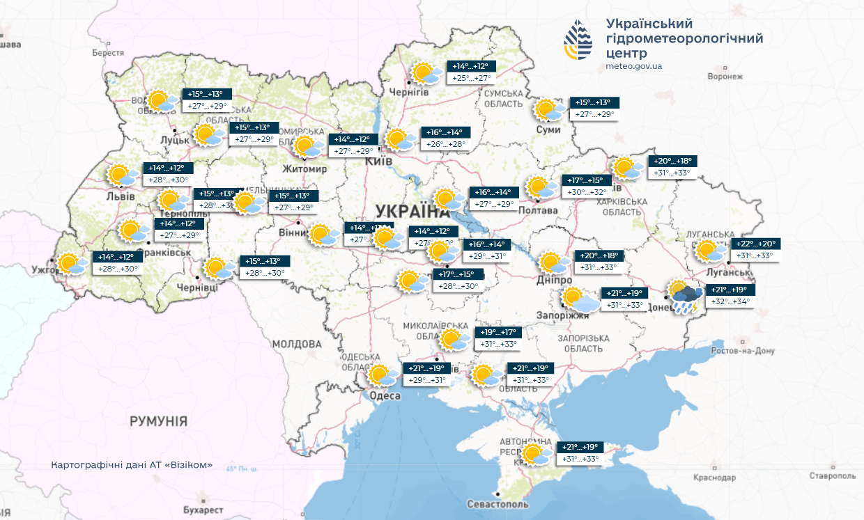 Загалом цими вихідними очікується стабільна і тепла погода, без дощів. У південно-східних областях України утримається спека з максимальними денними показниками в межах +31…+36 °С.