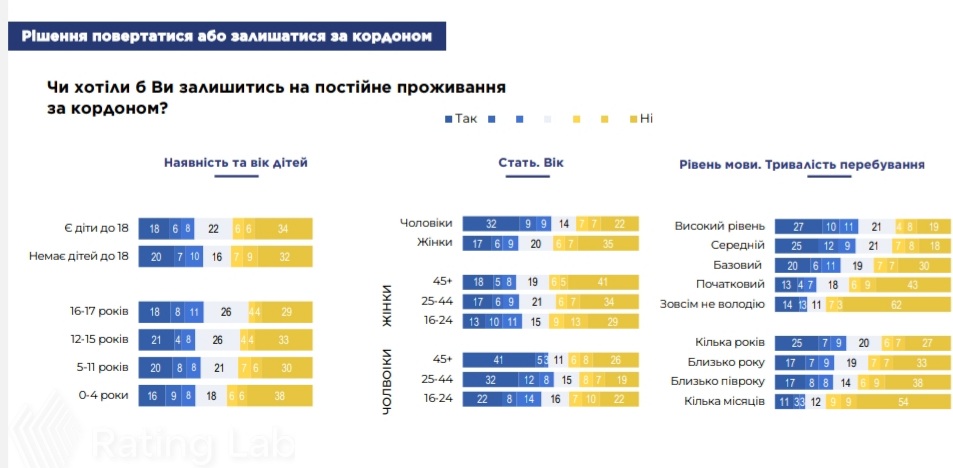 стать, вік, наявність та вік дітей - чоловіче населення значно більше орієнтовані залишитися за кордоном, ніж жінки. Як жінки, так і чоловіки середнього віку менше орієнтовані на повернення в Україну, ніж наймолодші (16-24) та найстарші (45-55+). Українці з дітьми шкільного віку дещо більше думають про те, щоб залишитись;