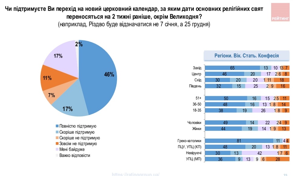 Найбільше підтримують перехід мешканці західних областей (78%) та особливо греко-католики (92%). Серед прихожан УПЦ (КП) 60% підтримують цю ініціативу. Мешканці південних та східних областей дещо менше підтримують перехід на новий календар, проте там близько половини "за" перехід.