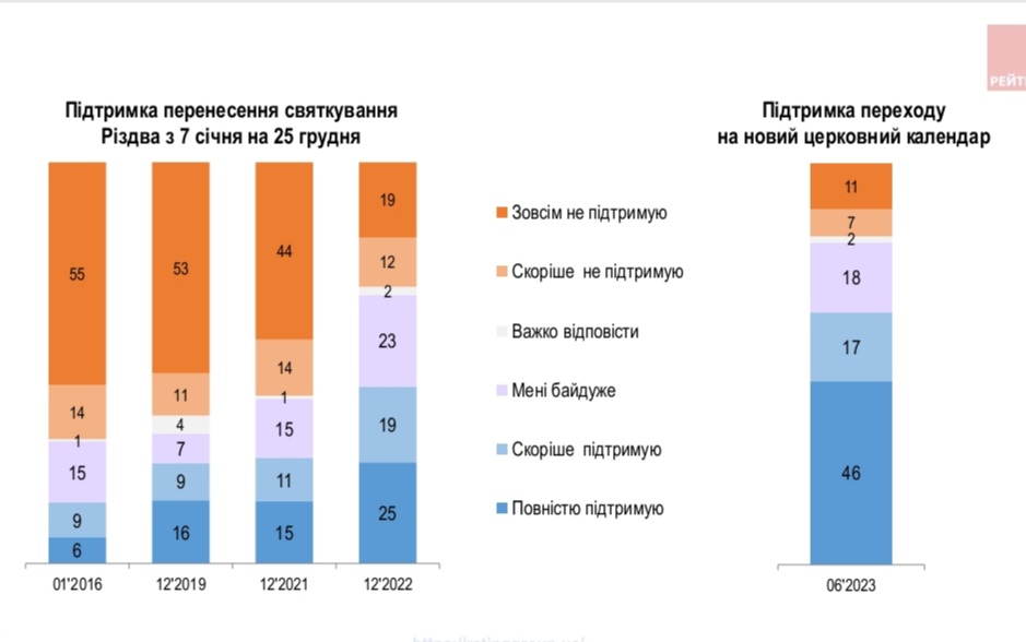 За оцінками соціологів, підтримка переходу на новий церковний календар, зокрема перенесення Різдва є вищою, ніж була в грудні минулого року: так у грудні перенесення Різдва на 25 грудня підтримали 44% і не підтримали – 31%, нині 63% підтримують перехід на новий календар і 18% - не підтримують.
