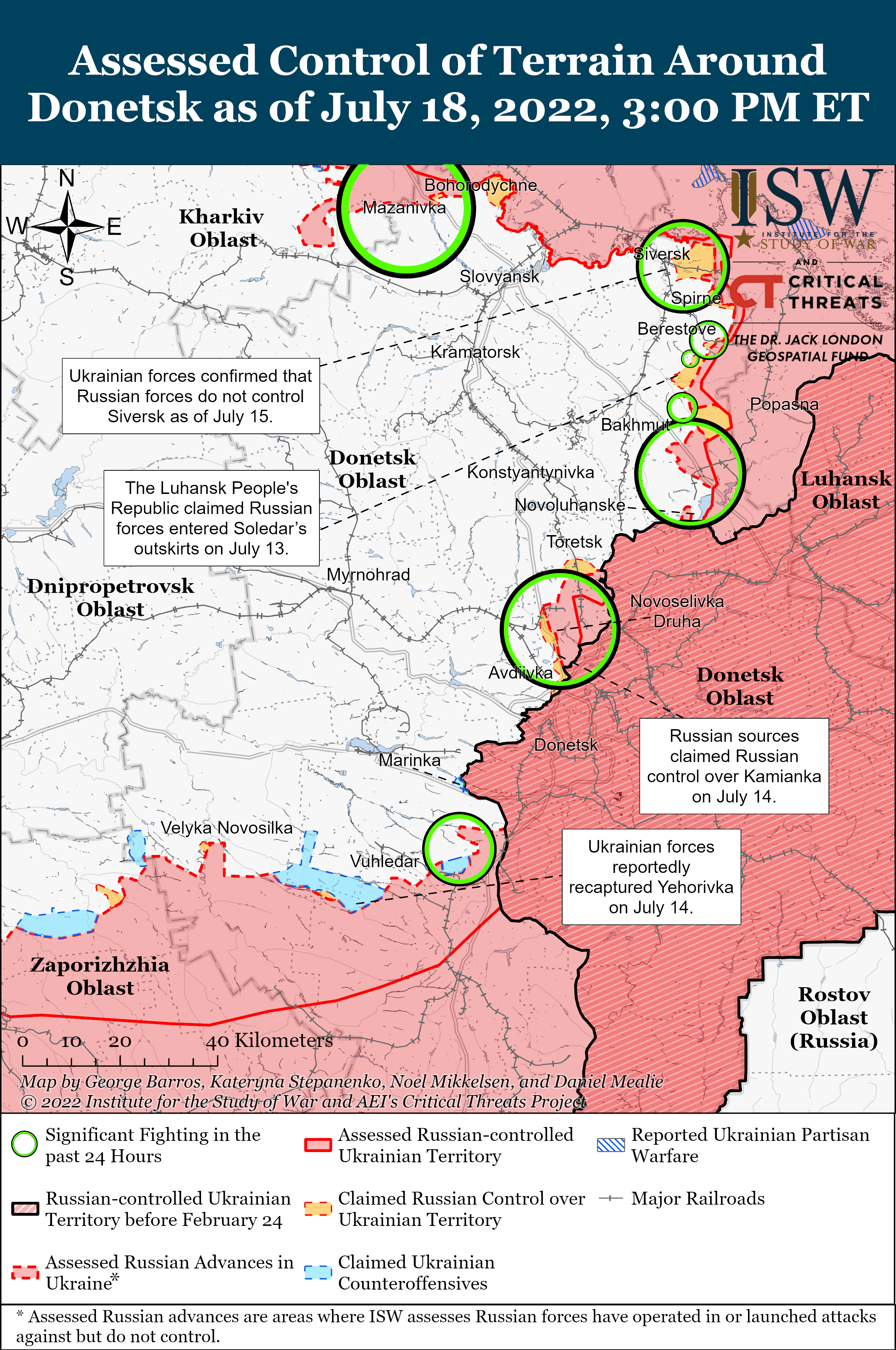 Тоді як біля Слов'янська росіяни наносили переважно артилерійські та ракетні удари, що може означати підготовку до наступу. Проте пріоритетність саме бахмутського та сіверського напрямків підтверджується активністю на фронті.