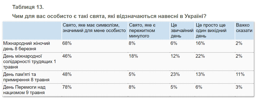 День пам'яті та примирення 8 травня для 48% опитаних - свято, яке має символізм, значимий для них особисто. Для 5% громадян - це пережиток минулого. Ще 23% зазначили, що 8 травня - це звичайний день, а для 13% українців - це просто додатковий вихідний.