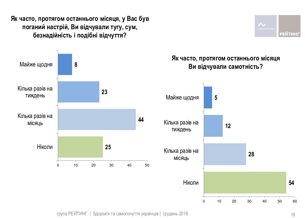 При цьому 23% повідомили про такі відчуття кілька разів на тиждень, майже половина (44%) - кілька разів на місяць. У той же час чверть респондентів (25%) не помічали за собою поганого настрою останнім часом.