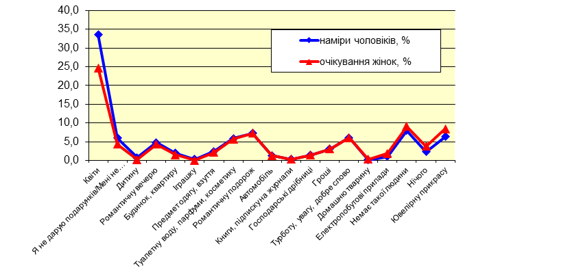 В цілому бажання жінок та плани чоловіків практично співпадають, значущі розбіжності є лише в двох позиціях: чоловіки дарують квіти частіше, ніж хотіли б жінки (32%чоловіків проти 25% жінок), та ювелірні прикраси навпаки, дарують рідше, ніж хотілося б жінкам (8% жінок проти 6% чоловіків).