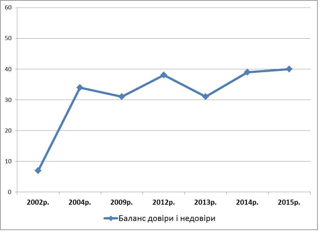 Баланс довіри і недовіри до соціологічних центрів (відсоток тих, хто довіряє, мінус відсоток тих, хто недовіряє) зріс з 2013 року – був +31% у листопаді 2013 року, став +39% у 2014 році и +40% у 2015 році.