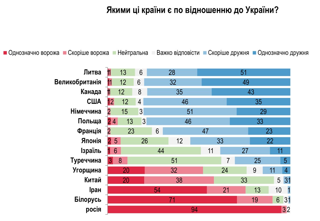 Лідером країн з ворожим ставленням до України є Росія – 97%. Так само ворожою країною оцінюють 90% українців Білорусь. Іран вважають країною з ворожим ставленням до України 75% респондентів.
