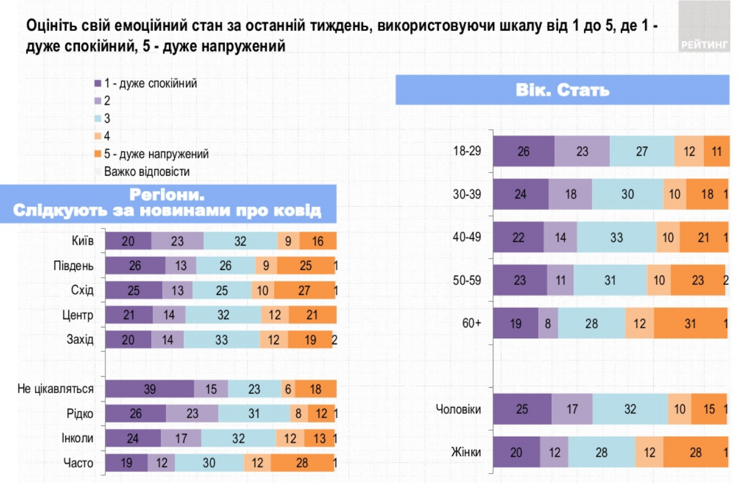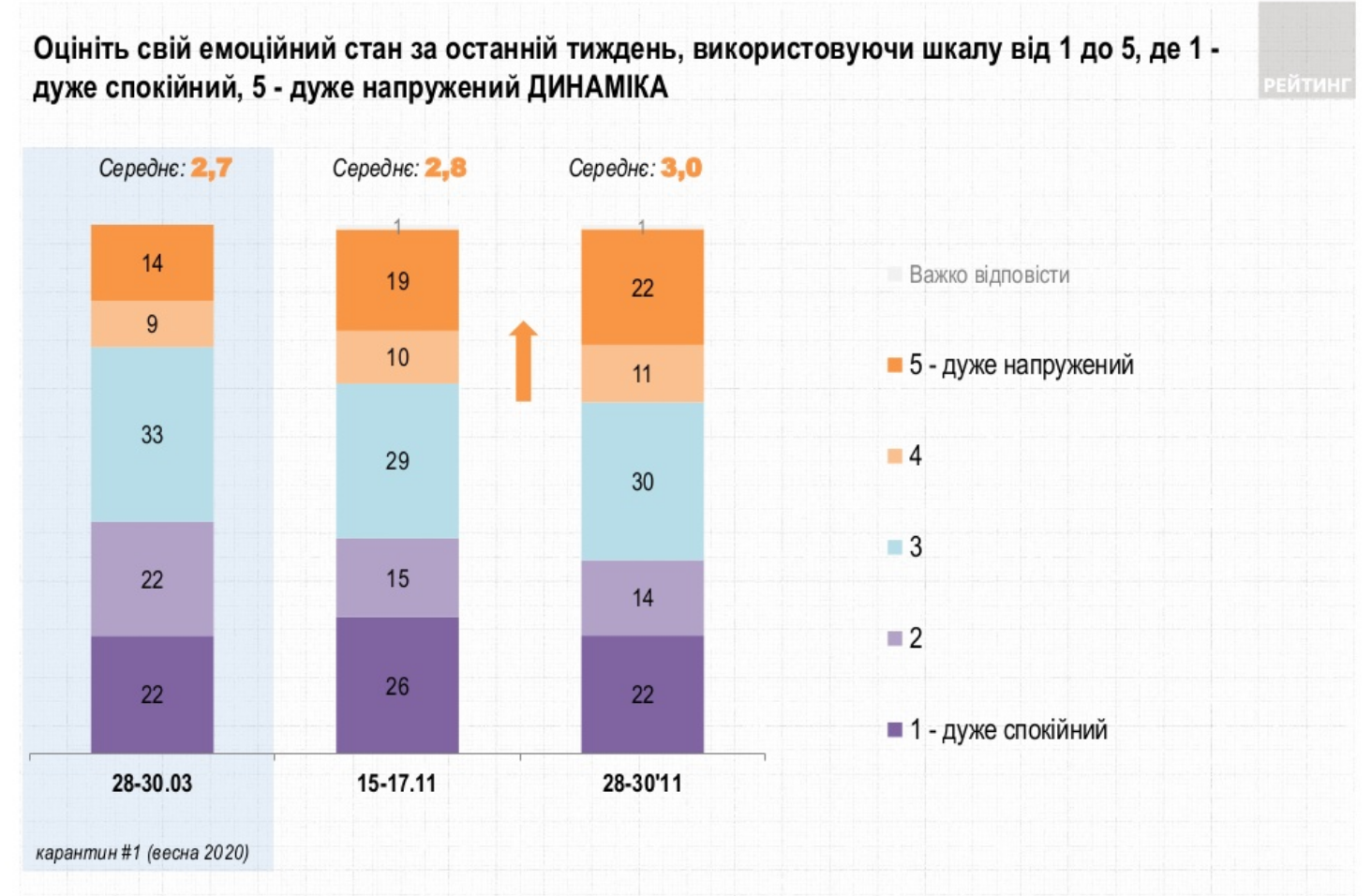Відзначається, що 33% оцінюють свій стан як напружений. Високий рівень тривожності фіксується серед жінок, літніх людей, а також тих, хто частіше відстежує новини про коронавірус.