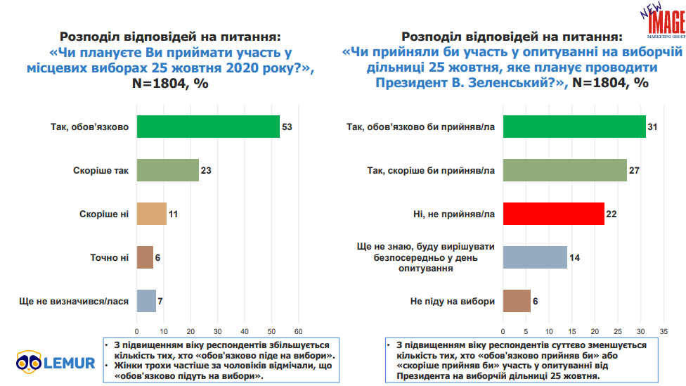 Водночас взяти участь у безпосередньо місцевих виборах планують 53% громадян, а скоріше за все підуть голосувати - 23%. Скоріше за все не підуть на вибори 11% опитаних, точно не підуть - 6%.