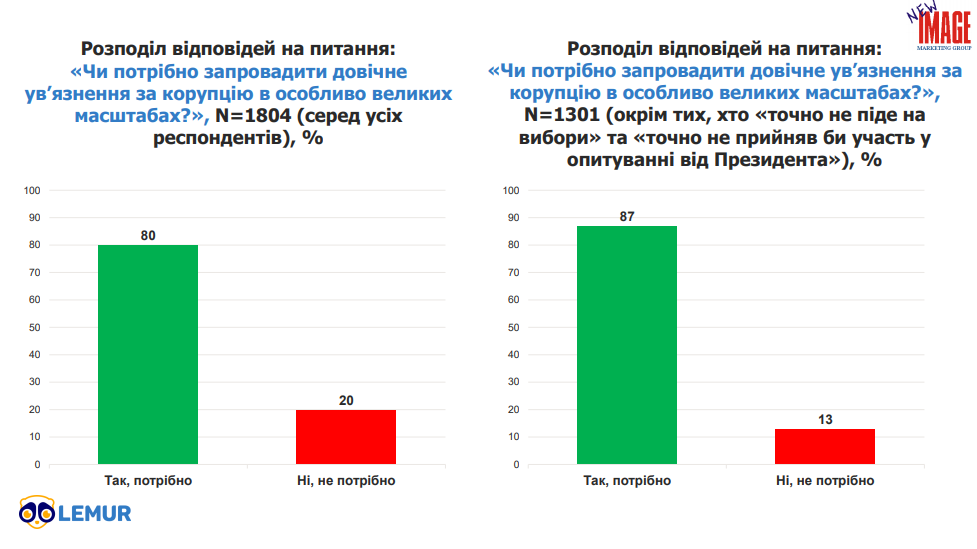На питання “чи потрібно запровадити довічне ув’язнення за корупцію в особливо великих масштабах?” 80% серед всіх опитаних відповіли ствердно, а 20% зазначили, що довічне ув’язнення не потрібне.