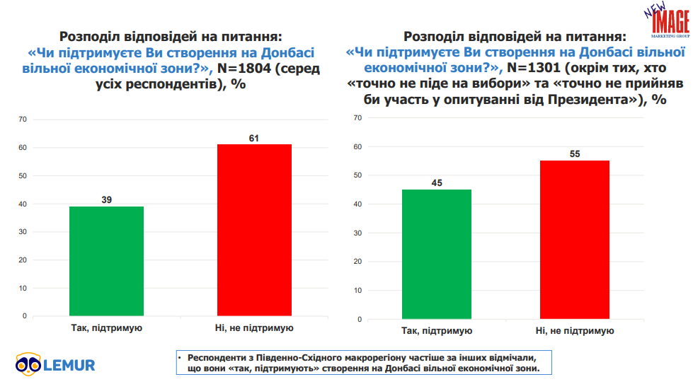 На питання “чи підтримуєте Ви створення на Донбасі вільної економічної зони?” 39% відповіли “так”. Не підтримують вільну економічну зону 61% опитаних.