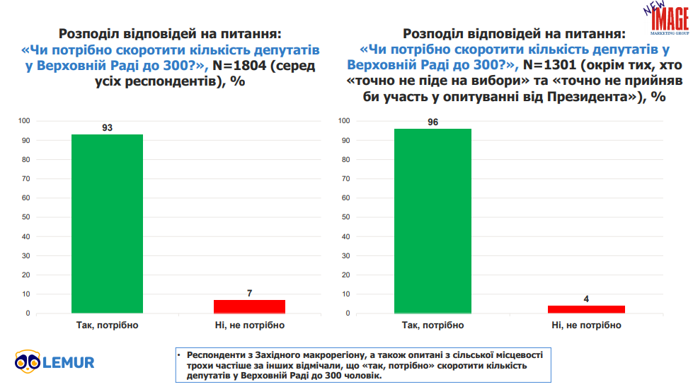 Ствердну відповідь на питання про те, “чи потрібно скоротити кількість депутатів у Верховній Раді до 300?” дали 93%. Протилежної думки притримуються 7%.