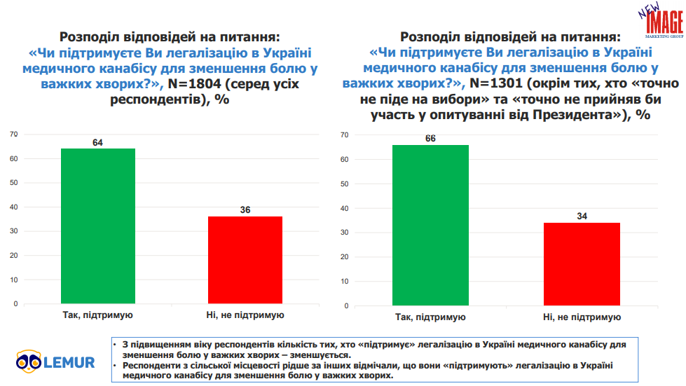 На питання “чи підтримуєте Ви легалізацію в Україні медичного канабісу для зменшення болю у важких хворих?” відповіли “так” - 64%, “ні” - 36%.