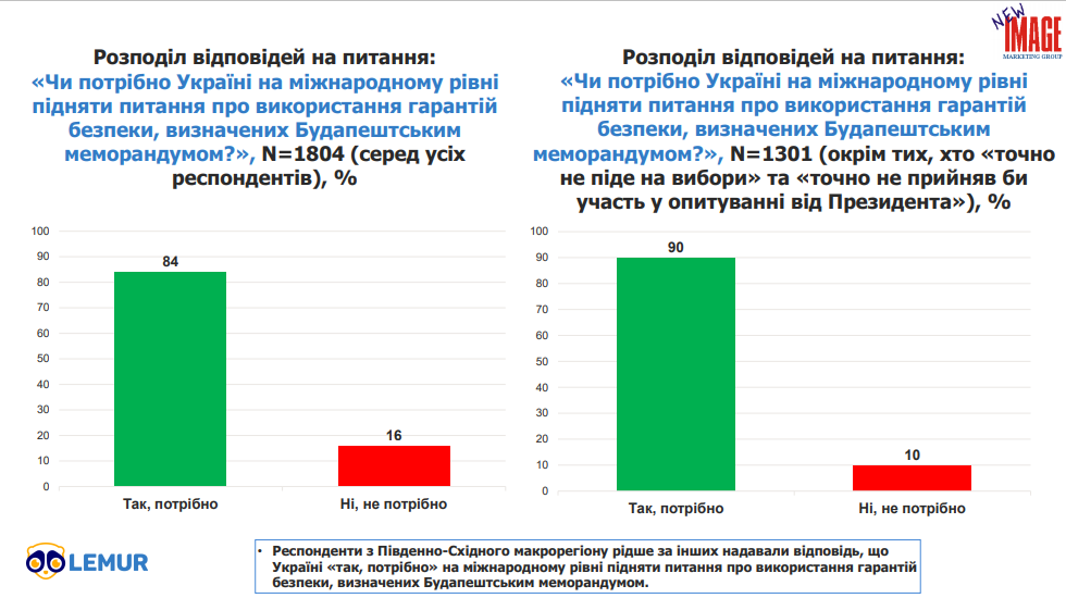 При цьому 84% громадян дали ствердну відповідь на питання "чи потрібно Україні на міжнародному рівні підняти питання про використання гарантій безпеки, визначених Будапештським меморандумом?". Протилежної думки притримуються 16% опитаних.