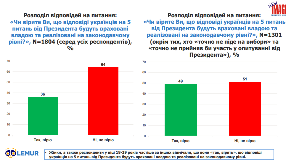 Однак, 64% громадян не вірять у те, що відповіді на 5 президентських запитань влада врахує та реалізує на законодавчому рівні.