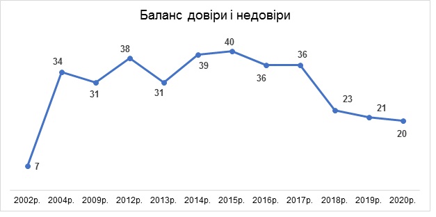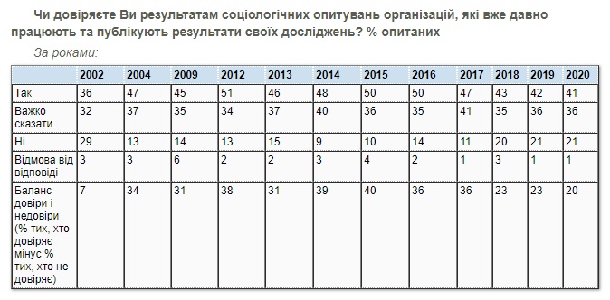 Баланс довіри і недовіри до соціологічних центрів (відсоток тих, хто довіряє, мінус відсоток тих, хто недовіряє) зріс з +31% у 2013 році до +40% у 2015-му. За останні два роки баланс знизився з +36% у 2017 році до +20% у 2020-му.