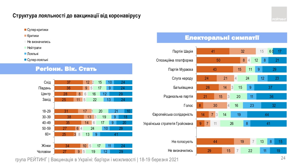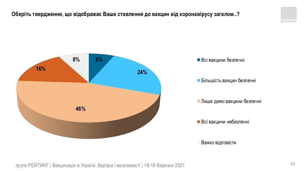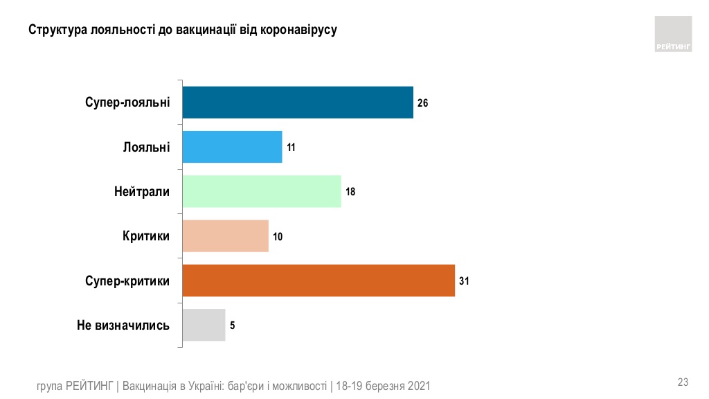 Критикують щеплення від COVID-19 41% громадян. При чому серед них 31% – супер критики, ще 10% – критики. Решта респондентів – «нейтральні».
