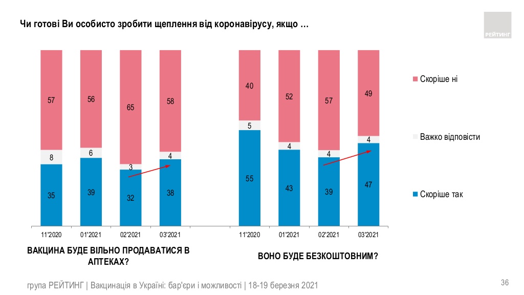 Соціологи зазначили, що початок кампанії з вакцинації дещо активізував бажання українців робити щеплення проти COVID-19. Зараз готові зробити платне щеплення 38% опитаних, а вакцинуватися безкоштовно – 47%. Водночас у лютому таких респондентів було менше. Минулого місяці на платні щеплення були згодні 32% громадян, а на безкоштовні – 39% опитаних.