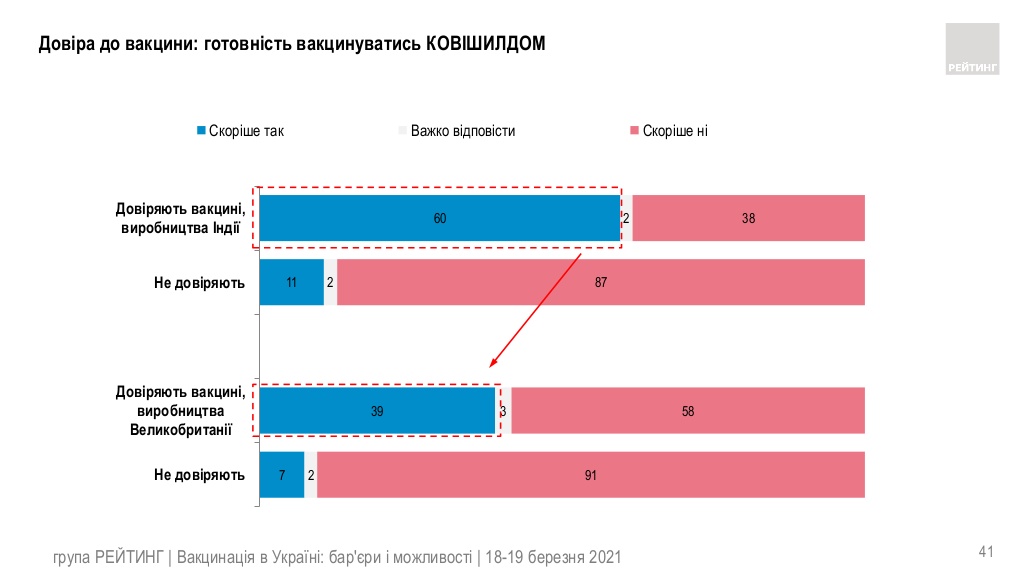 Дослідження показало, що опитані відносно більше довіряють вакцинам, виготовленим у Британії, США та країнах ЄС – таких близько половини. Не довіряють їм близько 20% респондентів. Вакцинам , виготовленим в Індії, довіряють 30% опитаних, не довіряють – 45%, вагаються з відповіддю – 23% громадян.