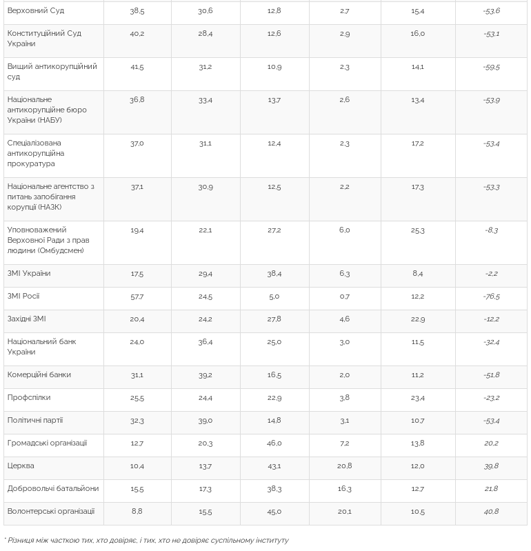 Найбільший рівень недовіри українці висловлюють стосовно російських ЗМІ (їм не довіряють 82% опитаних), державного апарату (80%), судів (судовій системі загалом) (79%).
