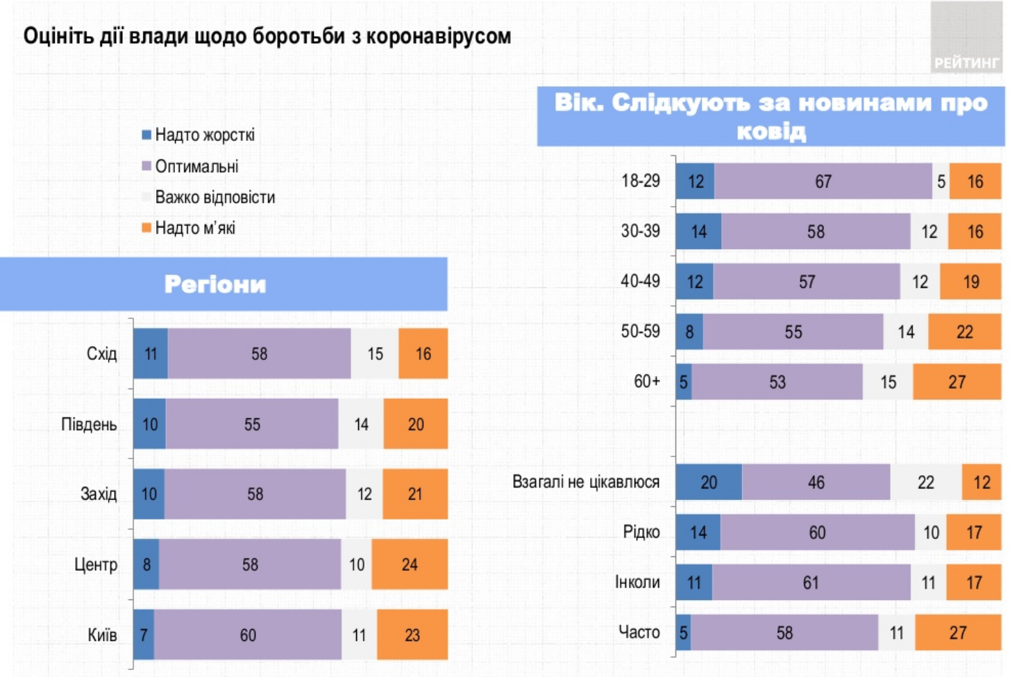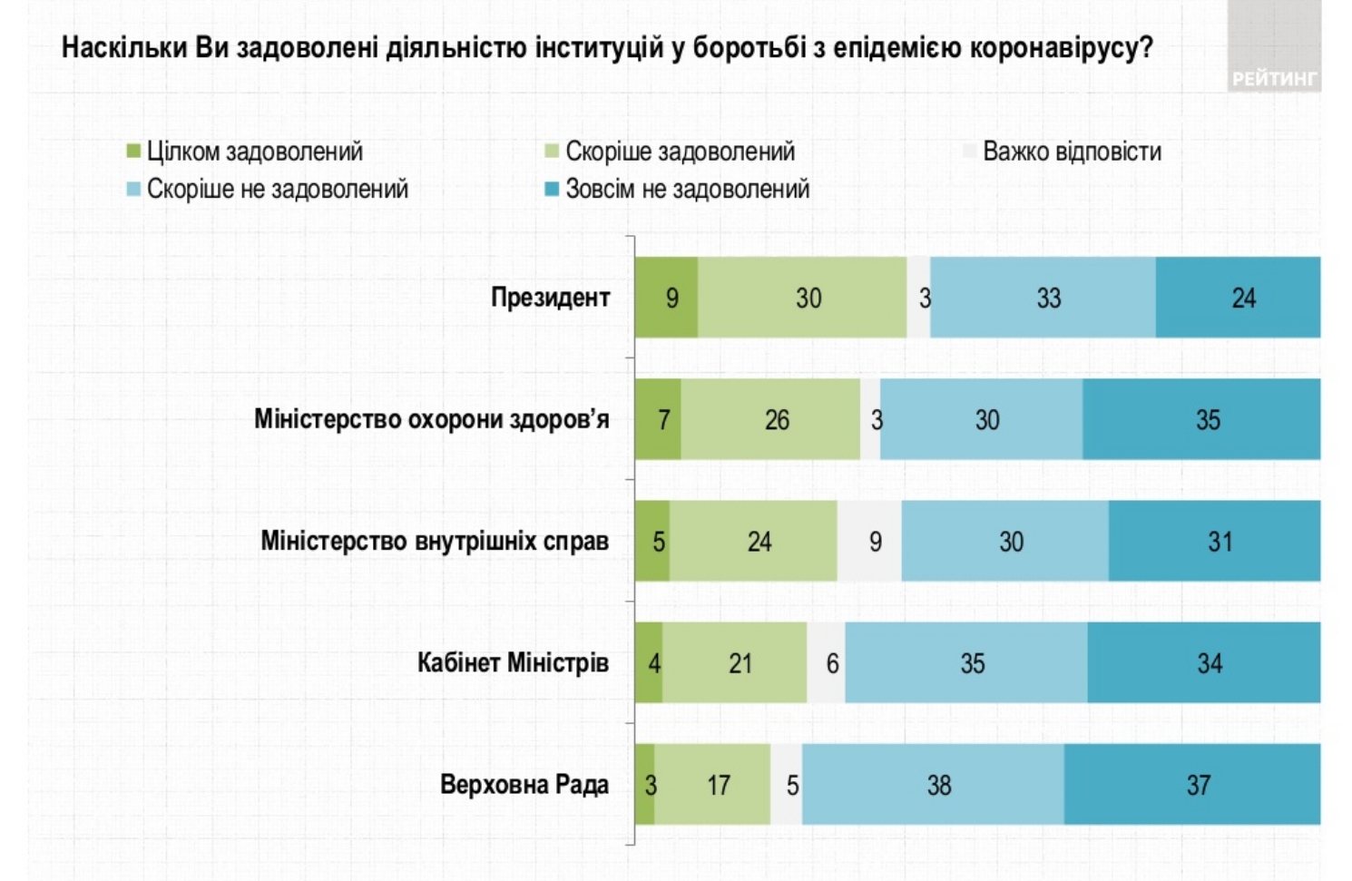 Відзначається, що 39% опитаних задоволені діяльністю президента в боротьбі з епідемією коронавірусу (57% - не задоволені). Діяльністю Міністерства охорони здоров'я задоволені 33%, незадоволені - 65%. Діяльністю Міністерства внутрішніх справ задоволені 29%, незадоволені - 61%. Діяльністю Кабінету Міністрів задоволені 25%, незадоволені - 69%.
