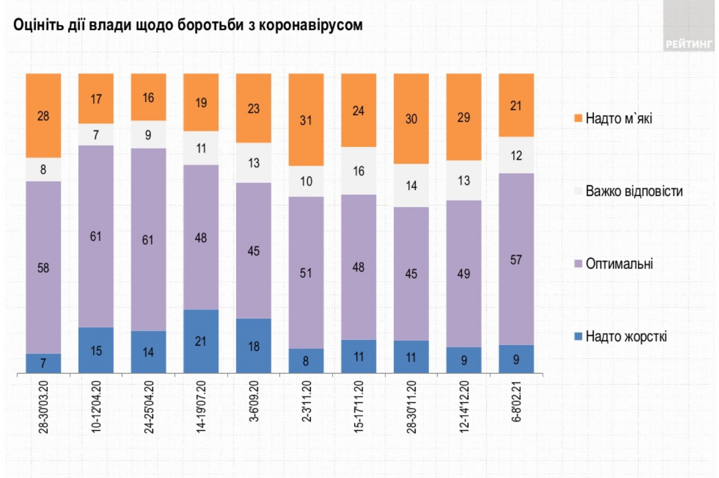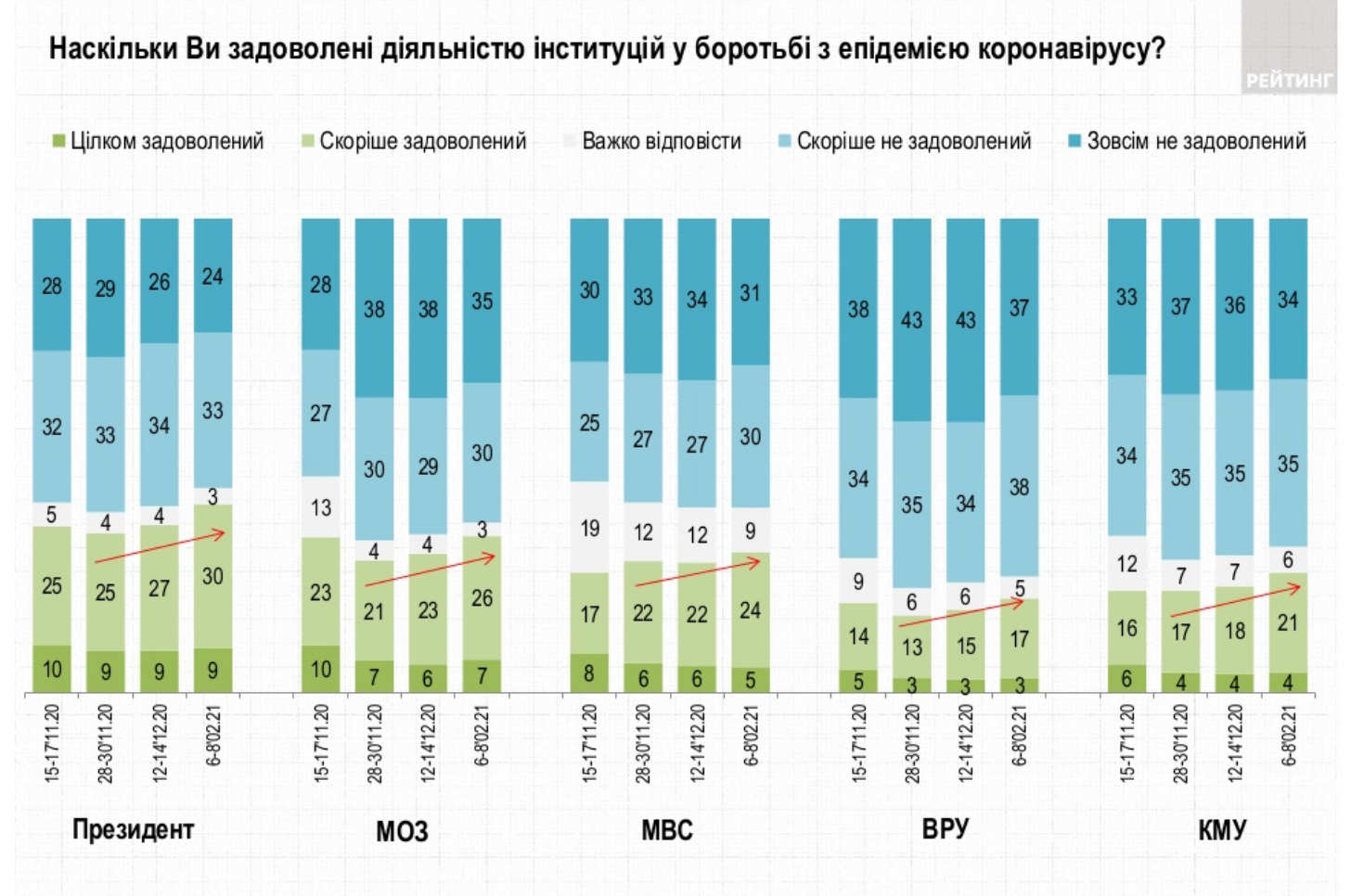 За останні кілька місяців в Україні підвищився рівень задоволеності роботою органів влади в сфері боротьби з епідемією COVID-19. Про це свідчать результати опитувань Соціологічної групи "Рейтинг", проведених протягом 6-8 лютого.