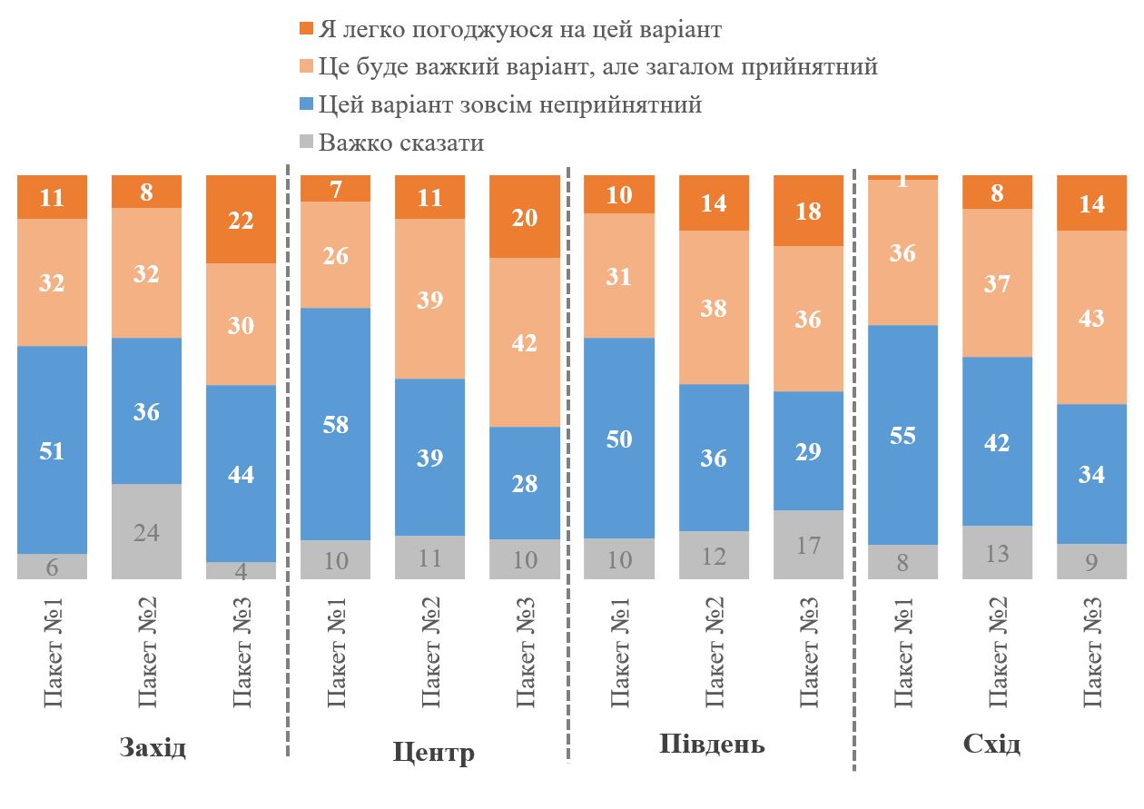Так, варіант із відкладенням визволення окупованих зараз територій та забороною на вступ до НАТО, проте із вступом до ЄС, підтримують 38%, а для більшості – 54% – такий варіант є категорично неприйнятним.