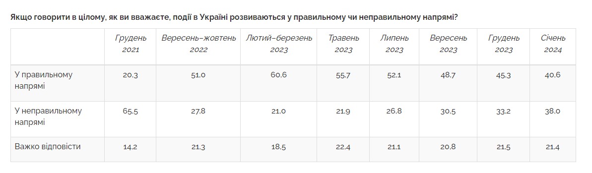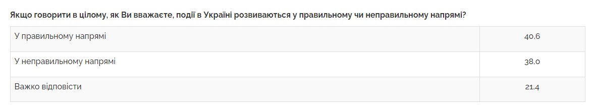 Частка громадян України, які вважають, що події в Україні розвиваються у правильному напрямку, зменшується із березня 2023 року, коли 61% опитаних українців заявляли, що все рухається правильно. Так, згідно з даними останнього опитування Центру Разумкова, частки тих, хто вважає, що події в Україні розвиваються у правильному напрямі (41%) і тих, хто дотримується думки, що вони розвиваються в неправильному напрямі (38%), знаходяться на одному рівні.