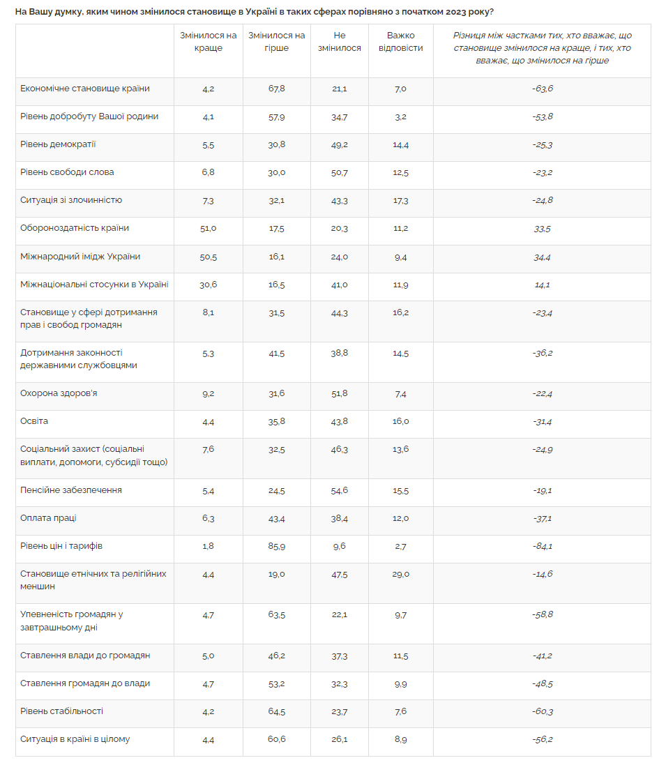 Найчастіше громадяни вказують на погіршення ситуації, порівняно з початком 2023 року, в таких сферах: рівень цін і тарифів, економічне становище країни, рівень стабільності, упевненість у завтрашньому дні, рівень добробуту їхньої родини, ставлення громадян до влади. При цьому 61% опитаних вказують на погіршення ситуації в країні в цілому.