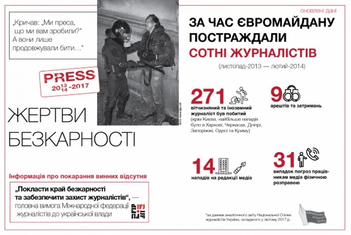 У НСЖУ наголосили на тому, що рік тому було підготовлено спеціальний звіт "Жертви безкарності", присвячений журналістам, які постраждали на Майдані та у регіонах під час виконання професійного обов'язку. Проте на четвертиу річницю Революції гідності справи жодного із понад 20 журналістів, чиї детальні історії були оприлюднені у звіті, не зрушили з мертвої точки.