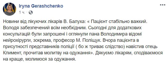 "Пацієнт стабільно важкий. Володя забезпечений всім необхідним. Сьогодні для додаткових консультацій були запрошені і оглянули пана Володимира відомі нейрохірурги, зокрема професор М.Поліщук", - написала Геращенко.