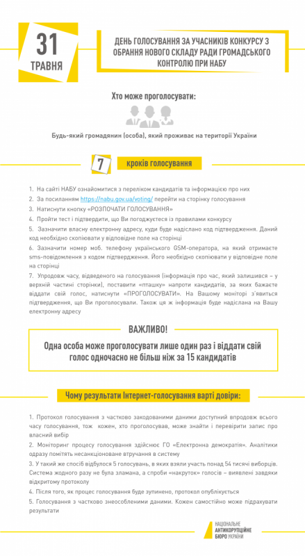 О дев'ятій ранку 31 травня почалося відкрите рейтингове інтернет-голосування за осіб, які виявили бажання працювати у складі Ради громадського контролю при Національному антикорупційному бюро України. Як повідомляє прес-служба 3, голосування триватиме протягом усього дня – до 21:00.