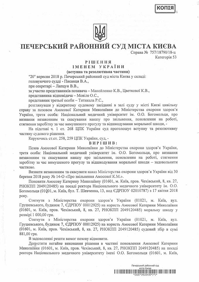 "Позов Амосової Катерини Миколаївни до Міністерства охорони здоров'я України, третя особа Національний медичний університет ім. О.О. Богомольця, про визнання незаконним та скасування наказу про звільнення, поновлення на роботі, стягнення заробітку за час вимушеного прогулу та відшкодування моральної шкоди - задовольнити частково", - йдеться в ухвалі суду.