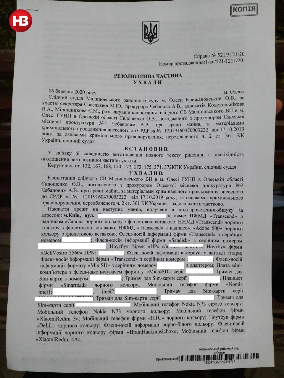 Малиновський районний суд Одеси наклав арешт на майно волонтерів громадської організації "Український кіберальянс", вилучене про них поліцією під час обшуків. Рішення про арешт майна виніс суддя Олег Крижановський на засіданні у п'ятницю, 6 березня.
