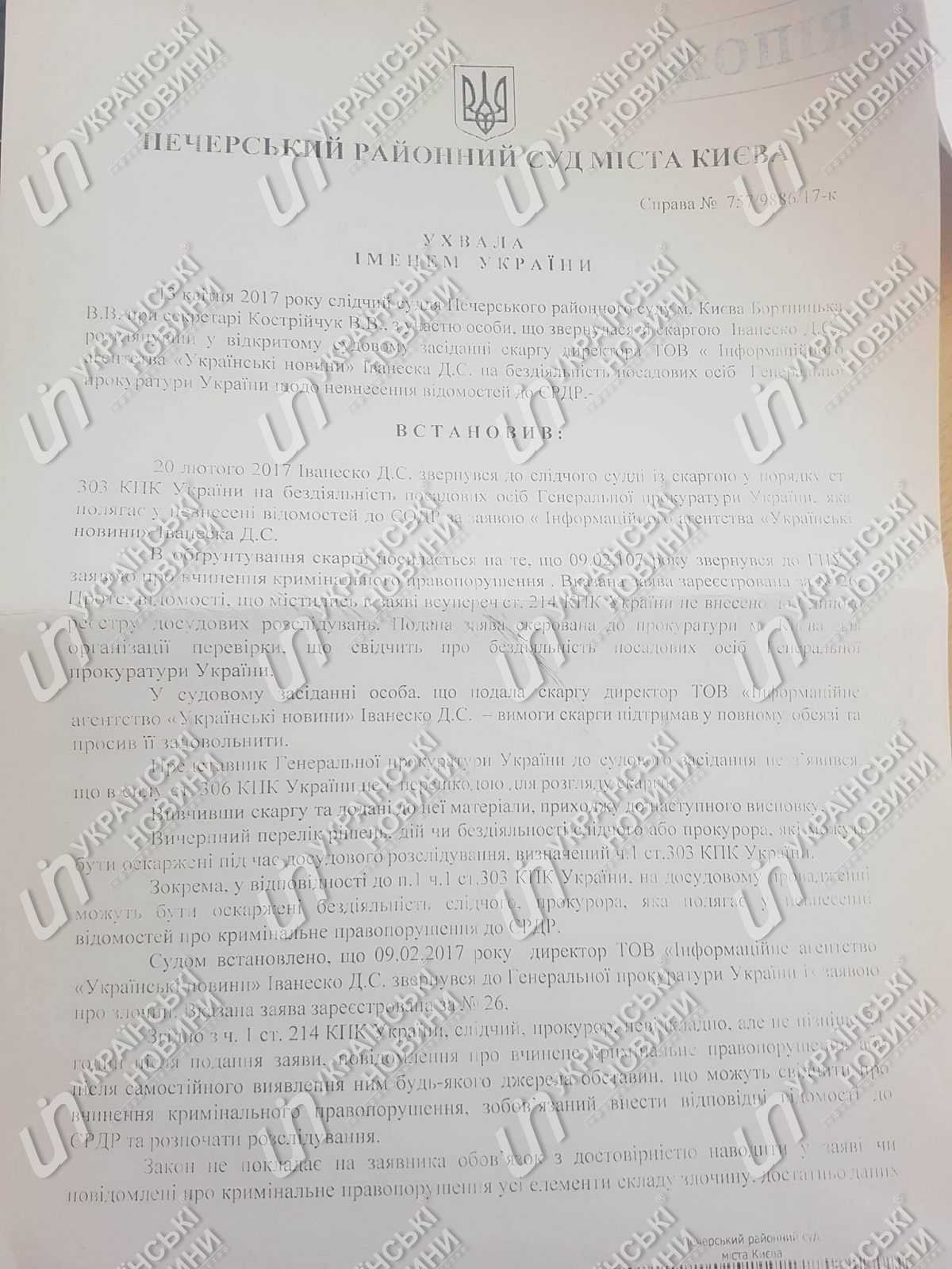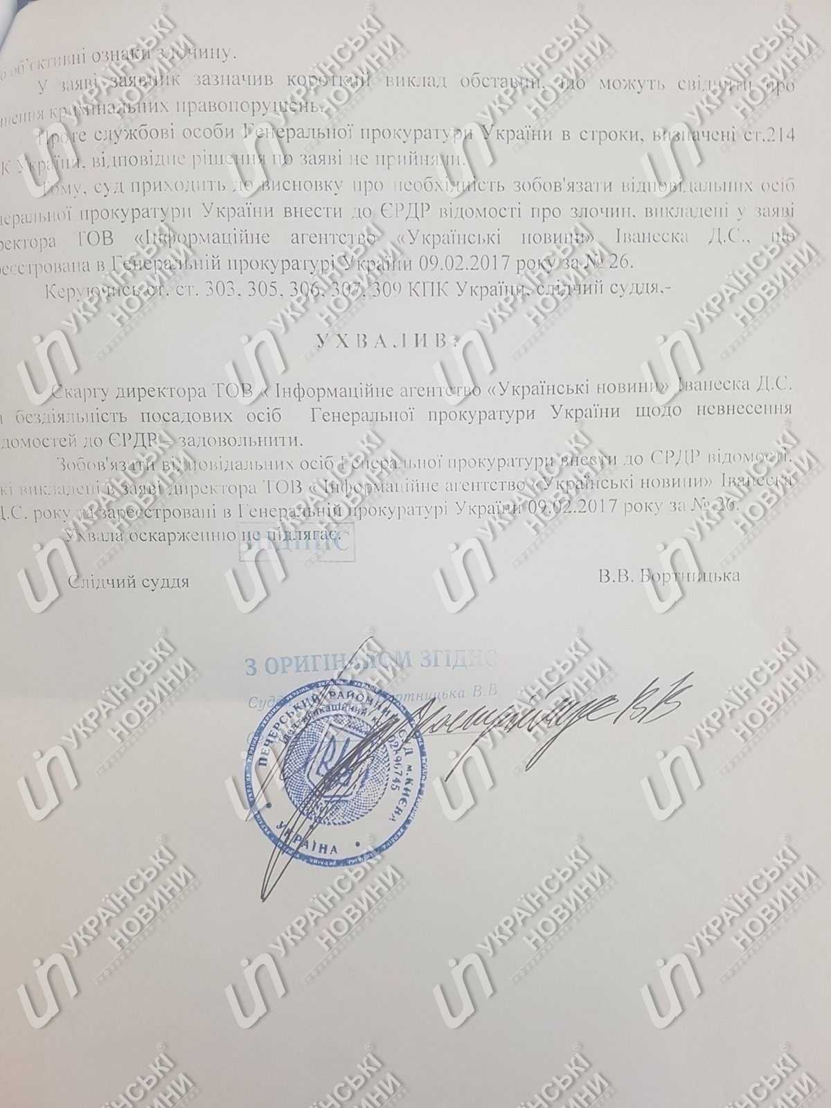 ГПУ відмовлялася реєструвати провадження за заявою "Українських новин", посилаючись на "не викладені в повному обсязі елементи складу злочину", однак суд відхилив цей аргумент.