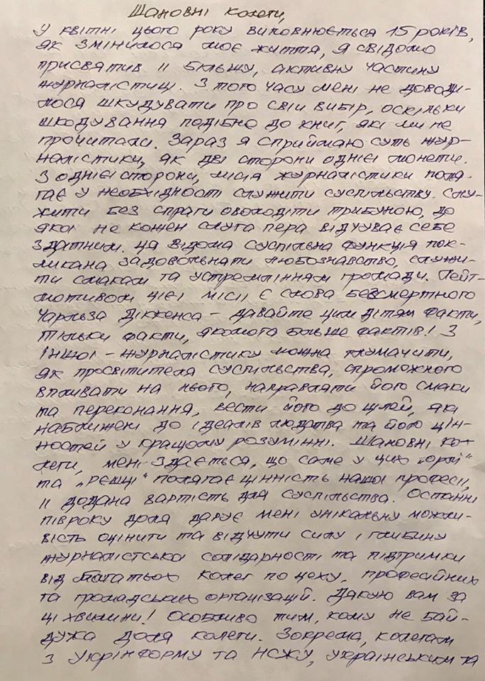 "Я вам щиро дякую і вірю, що незабаром настане той день, коли зможу подякувати вам особисто", - підсумував журналіст.
