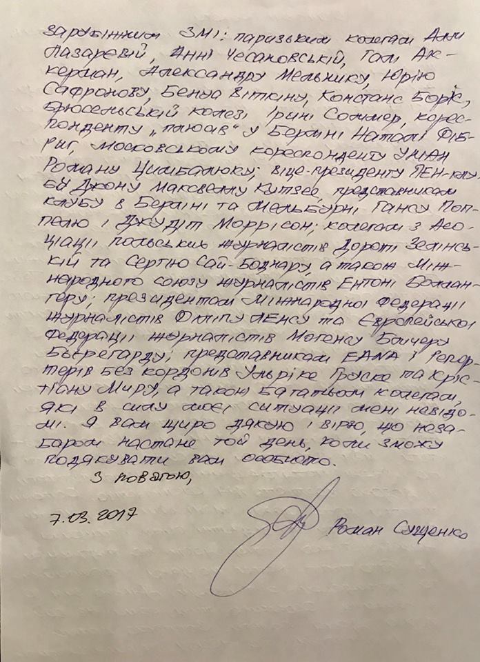 Сущенко також подякував за підтримку НСЖУ, Міжнародній та Європейській федерації журналістів, Європейському альянсу інформаційних агентств, Асоціації польських журналістів, організації "Репортери без кордонів" та представникам ПЕН-клубу.