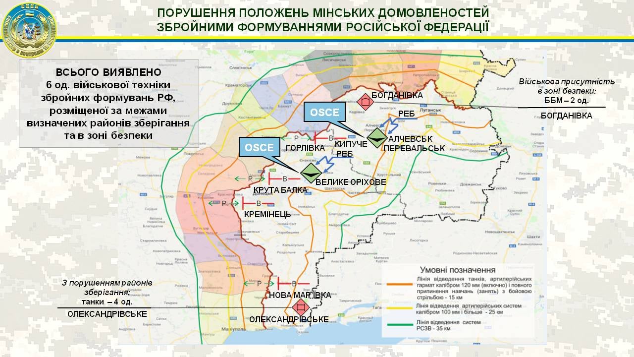 Уточнюється, що у зоні дій про 1 армійського корпусу ЗС РФ, у районі н.п. Олександрівське виявлено 4 танки, розміщені за межами виділених місць зберігання озброєння.