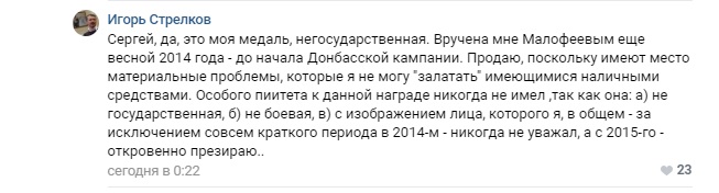 "Так, це моя медаль, недержавна. Вручена мені Малофєєвим (російським олігархом, засновником відповідного фонду і меценатом Російської православної церкви Костянтином Малофєєвим – ред.) ще навесні 2014 року – до початку Донбаської кампанії. Продаю, оскільки мають місце матеріальні проблеми, які я не можу "закрити" наявною готівкою", - пише він.