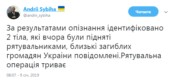 "За результатами впізнання ідентифіковано 2 тіла, які вчора були підняті рятувальниками, близькі загиблих громадян України повідомлені. Рятувальна операція триває", - йдеться у повідомленні.