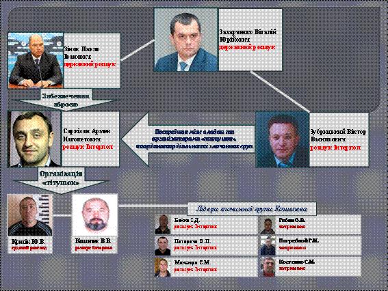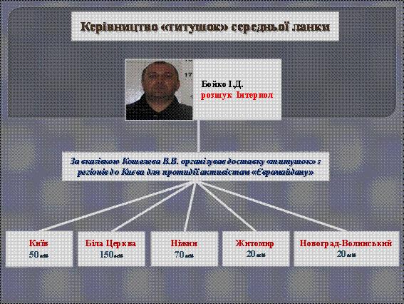 Також правоохоронці оприлюднили схему керівництва "тітушками", у тому числі керівників середньої ланки. Всі вони оголошені в розшук.