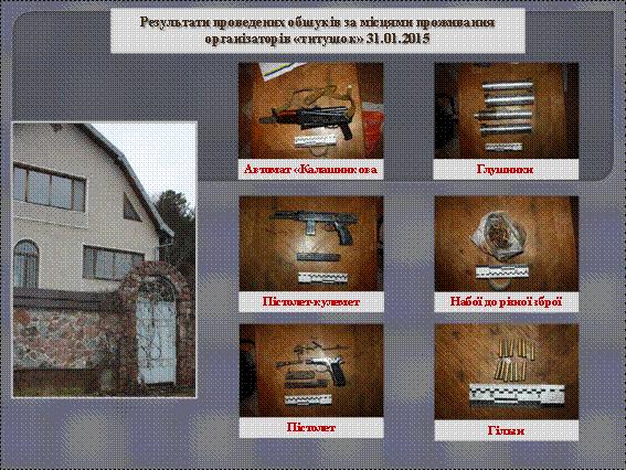 Крім того, міліціонери вилучили цілий арсенал зброї, набоїв, боєприпасів, вибухівки, а також різного спорядження, яке використовувалося найманими "бойовиками" під час розгону протестних акцій і нападів на активістів Майдану 18 лютого 2014-го Маріїнському парку і на Софіївській площі в Києві.