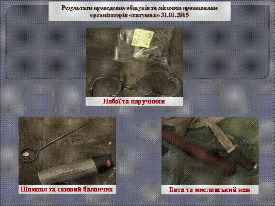 31 січня, повідомляють у МВС, були затримані 13 "тітушок". Двох заарештували на підставі рішення суду, один затриманий на підставі статті 208 Кримінального кодексу України і чекає рішення суду щодо визначення запобіжного заходу. "Щодо решти десяти осіб їх процесуальний статус буде визначатися наслідком ГПУ після проведення експертиз по вилученому зброї, боєприпасів, холодної зброї та інших пристосувань для нанесення тілесних ушкоджень", - повідомили в МВС.