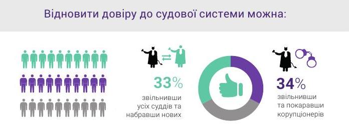 Третина українців (33%) переконані, що відновити довіру до системи можна, звільнивши абсолютно всіх суддів та набравши нових за прозорим конкурсом. Ще 34% сподіваються на повернення довіри після звільнень та покарань суддів-корупціонерів, свідчать дані опитування, проведеного компанією GfKUkraine.