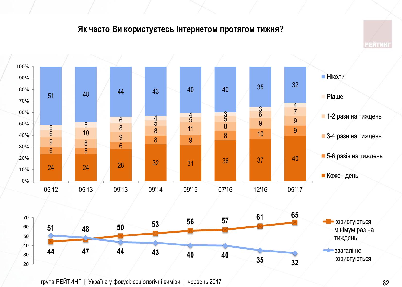 Всього користуються інтернетом 65% громадян. Взагалі не користуються інтернетом 32% респондентів.
