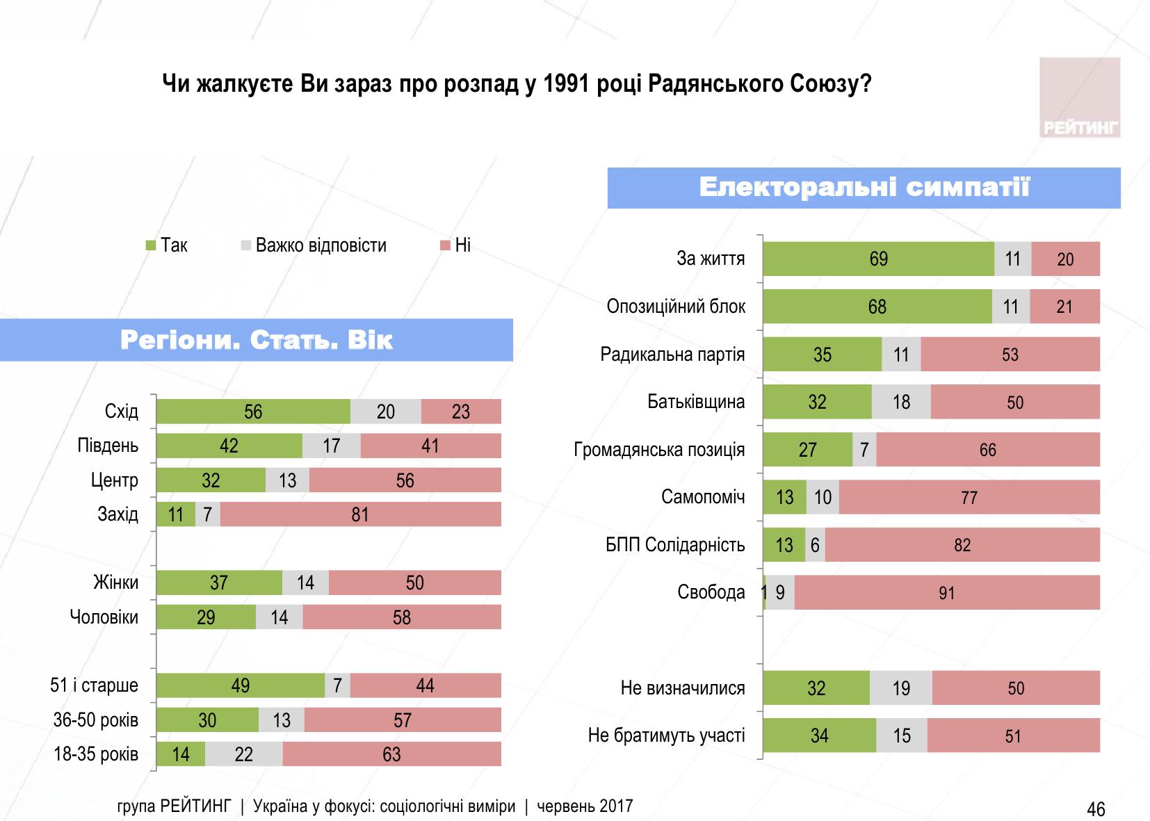 Найбільше жалкують про розпад СРСР у Східних і Південних регіонах, жінки і люди старшого віку, а також виборці партій "За життя" і "Опозиційний блок".