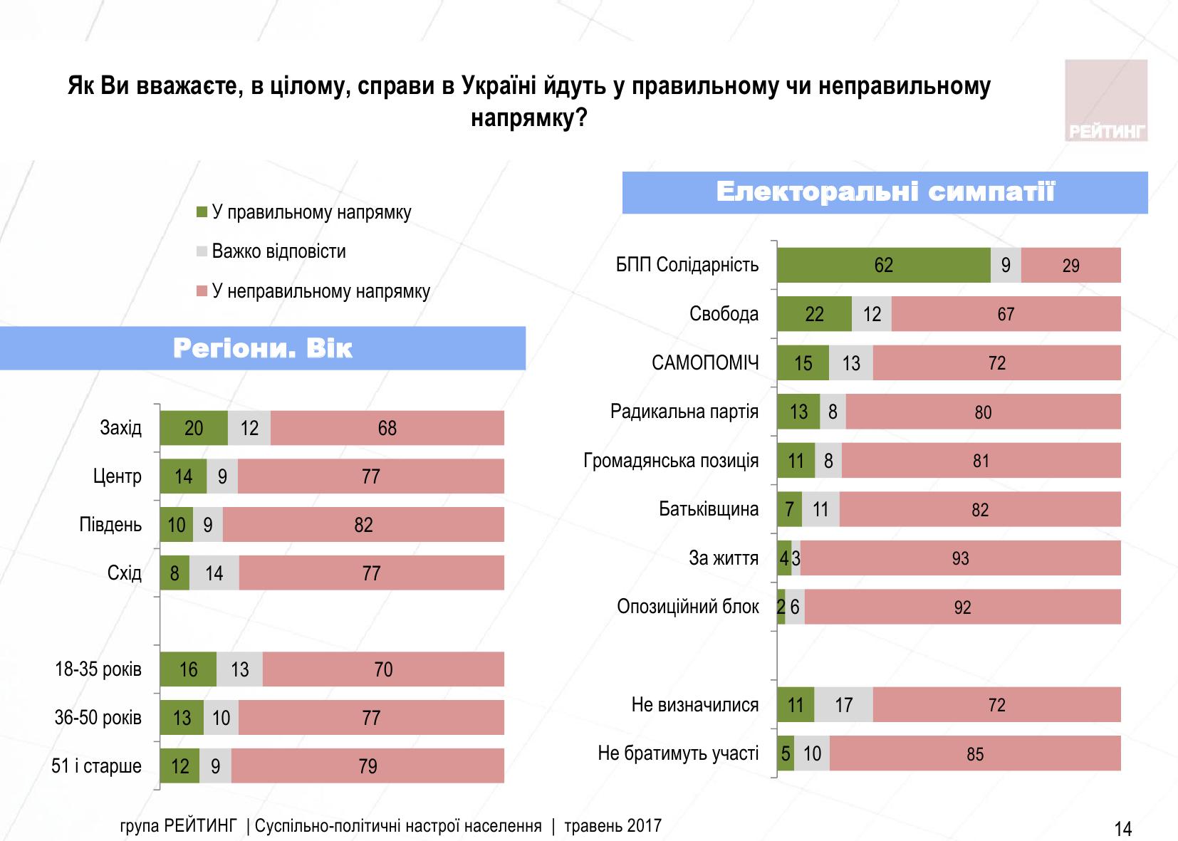 Як зазначають соціологи, більш позитивно оцінюють ситуацію в країні на Заході країни і молодь. Серед прихильників президентської партії "БПП Солідарність" 62% заявили, що задоволені ситуацією в країні.