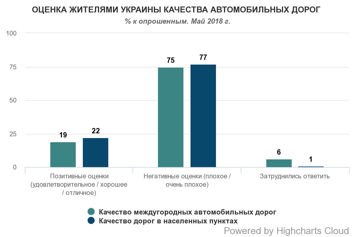 Три чверті українців дають негативні оцінки (погана, дуже погана) якості українських доріг (75% міжміських доріг та 77% доріг в населених пунктах), свідчать дані опитування компанії Research & Branding Group, проведеного в травні 2018 року.
