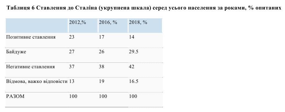 У лютому 2018 року 77% респондентів вважали, що "Сталін - жорстокий, нелюдський тиран, винний у знищенні мільйонів безневинних людей".